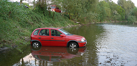 Zahlreiche Feuerwehrleute des Löschzugs Lohmar verbrachten den Abend des Ostersonntags mit Blick auf die Agger, wenn auch nicht ganz freiwillig. Denn im Flußbett parkte ein PKW, umspült vom zum Glück derzeit nur flachen Wasserlauf. Gegen 19.30 Uhr hatte eine Autofahrerin den 'Opel Corsa' vor dem Eingang des Campingplatzes an der Aggerstraße abgestellt. Nach dem Aussteigen machte sich das Fahrzeug selbständig und rollte die rund fünf Meter hohe steile Böschung zur Agger hinunter, bis er im Wasser zum Stehen kam.
